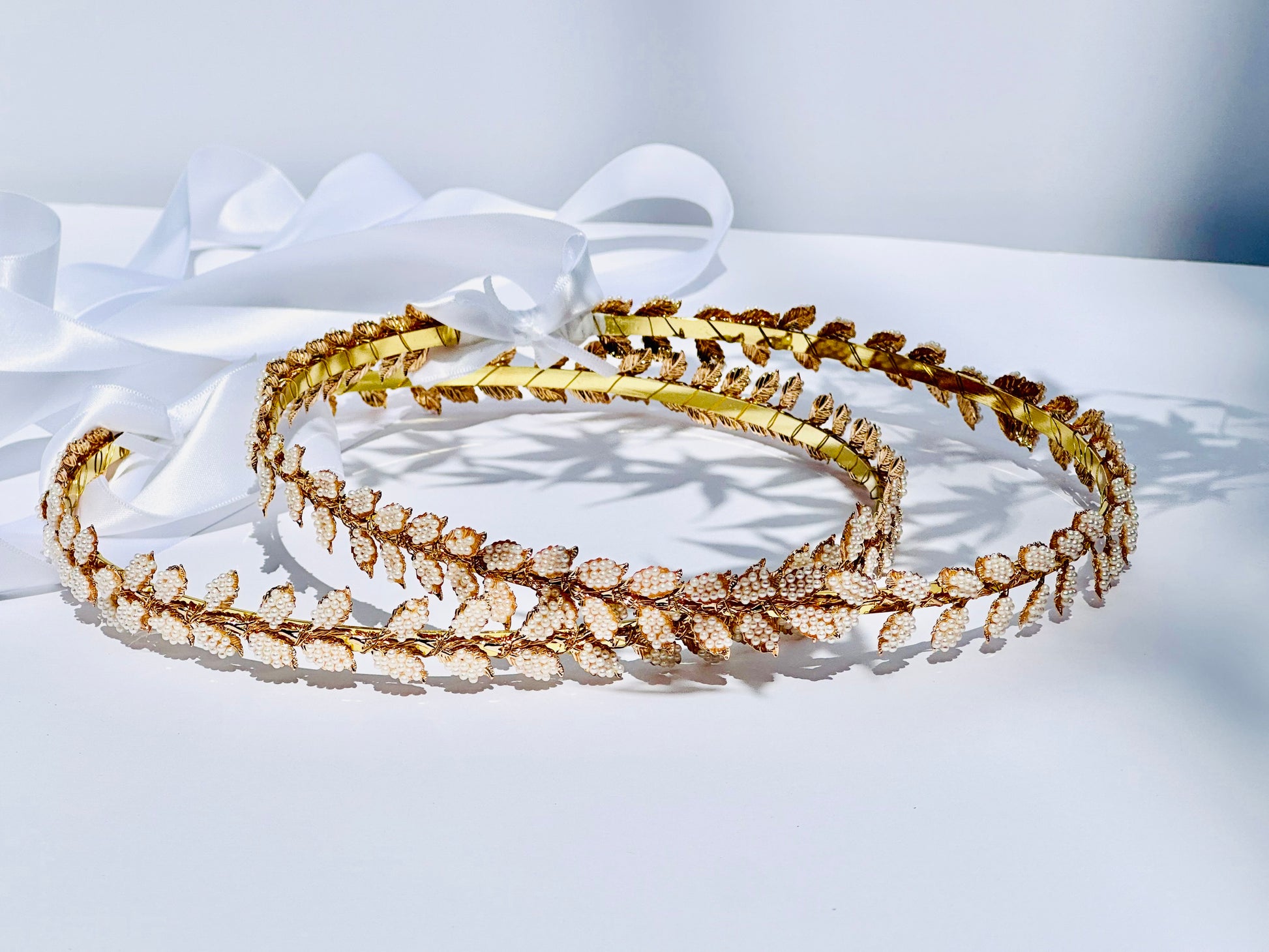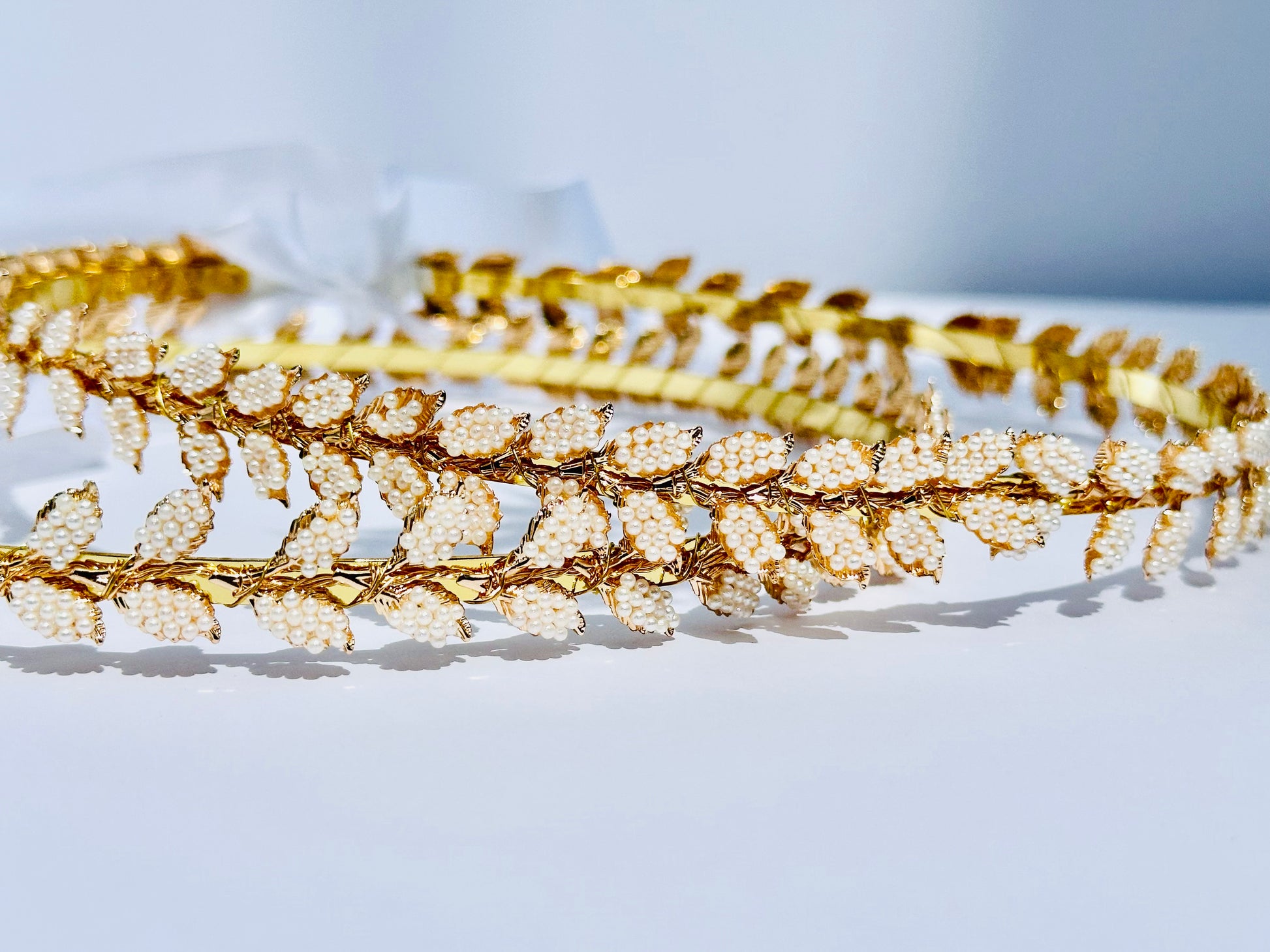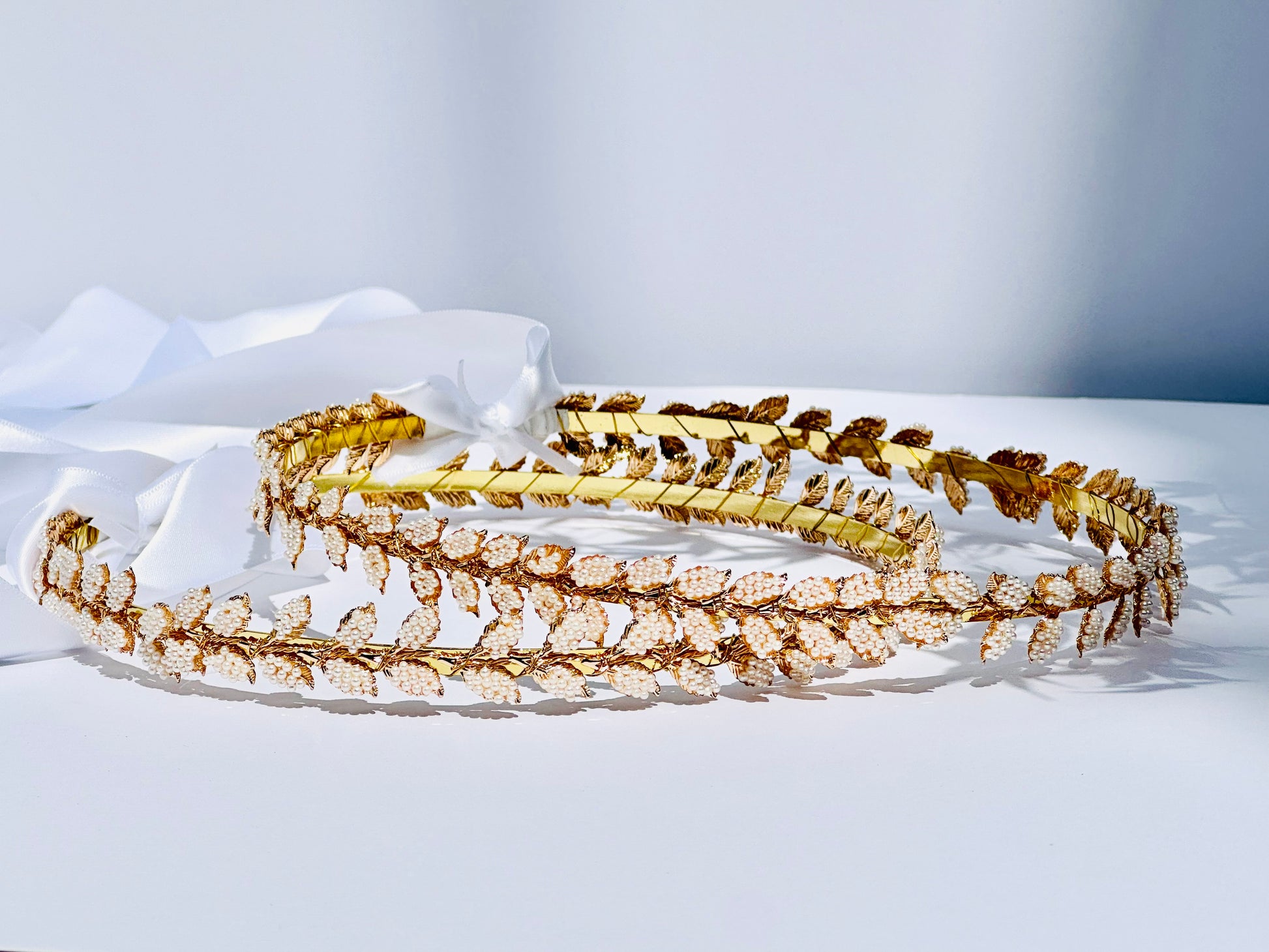 Beautiful 24ct Gold plated olive and pearl leaf stefana