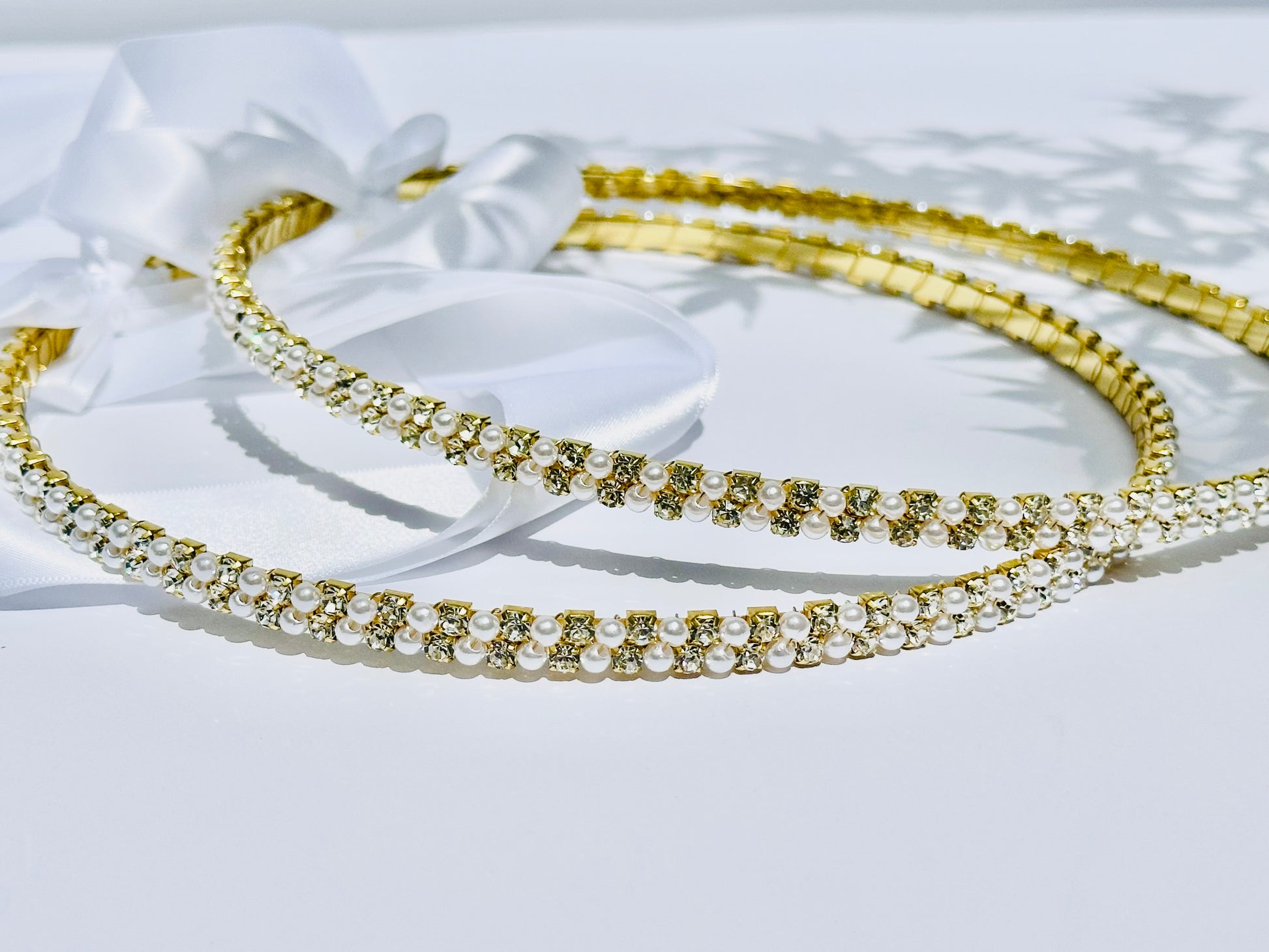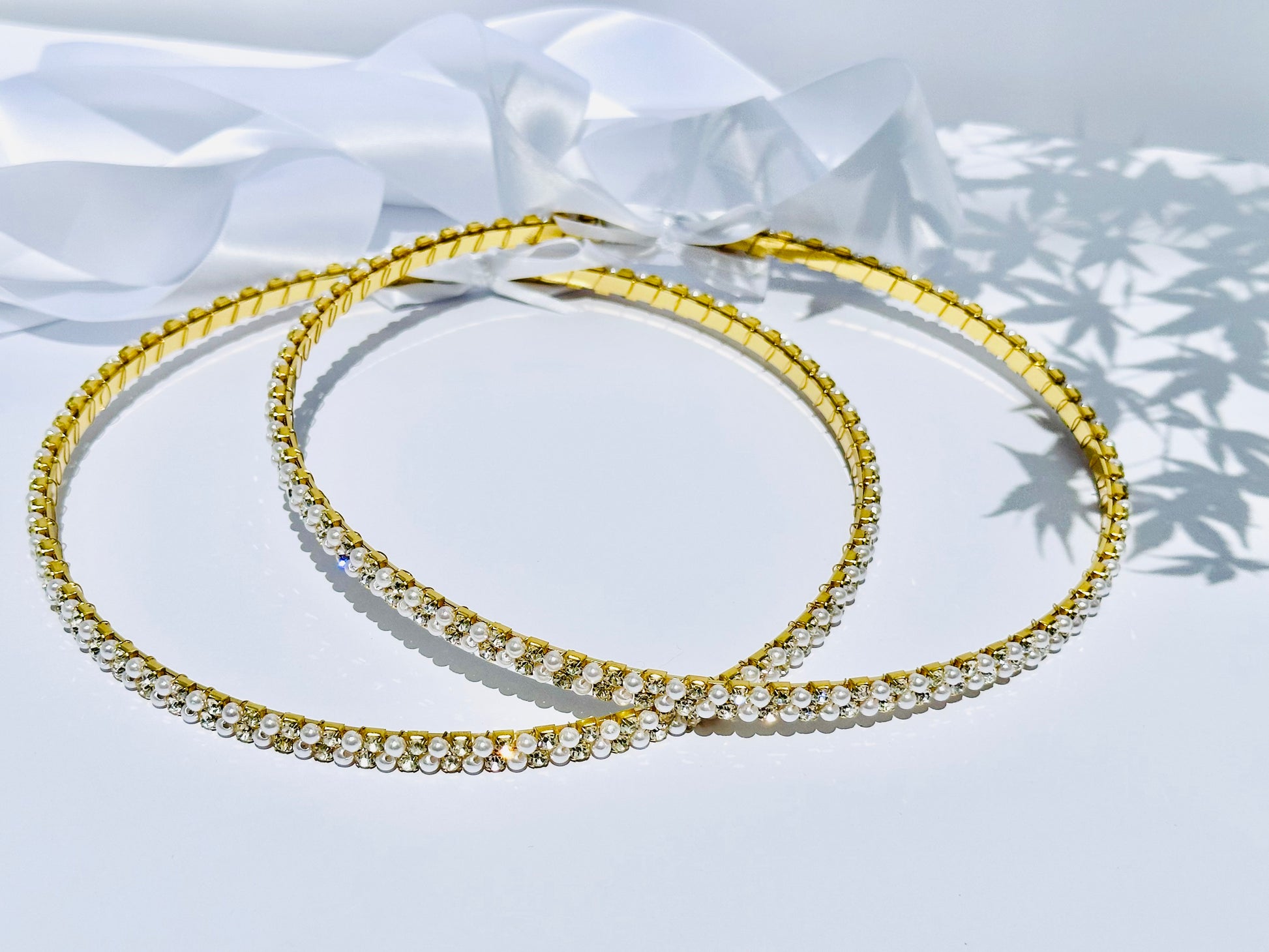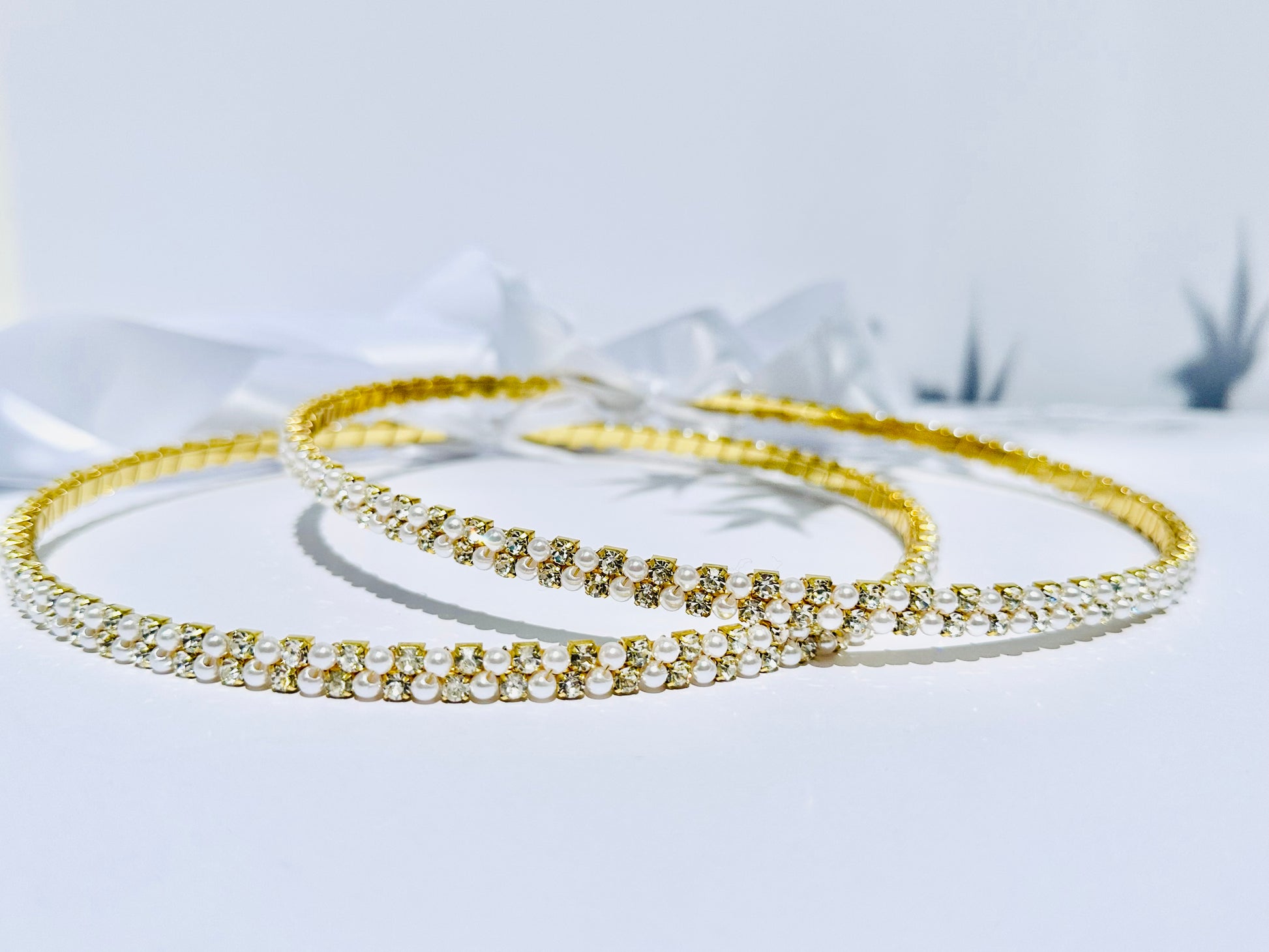 Elegant crystals with 3mm white pearl thick double row design on Gold plated band
