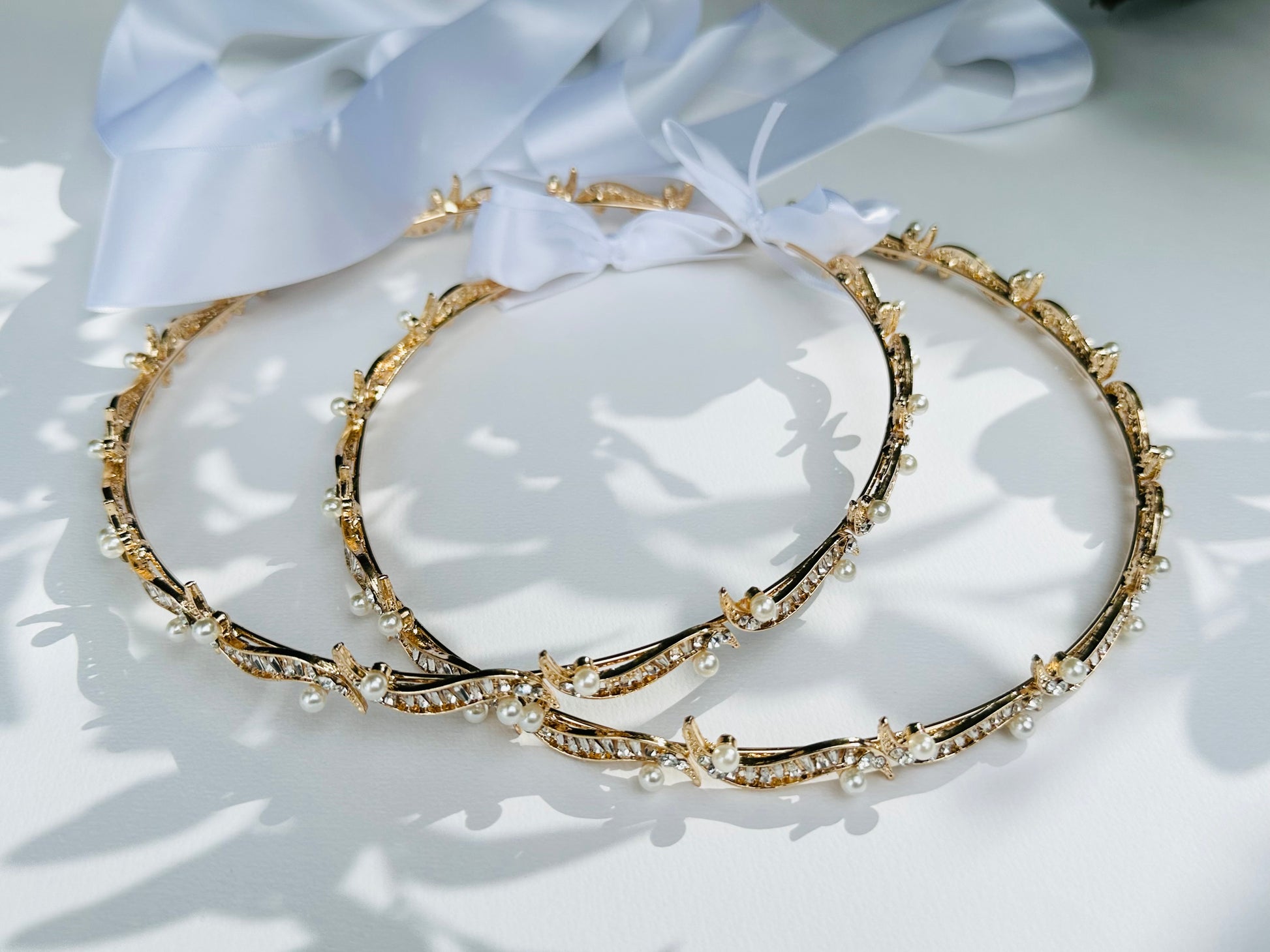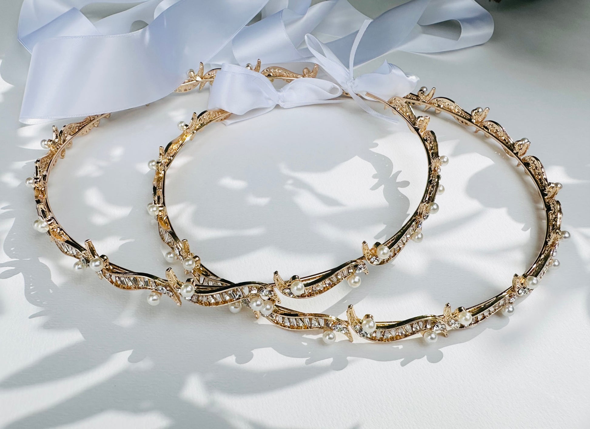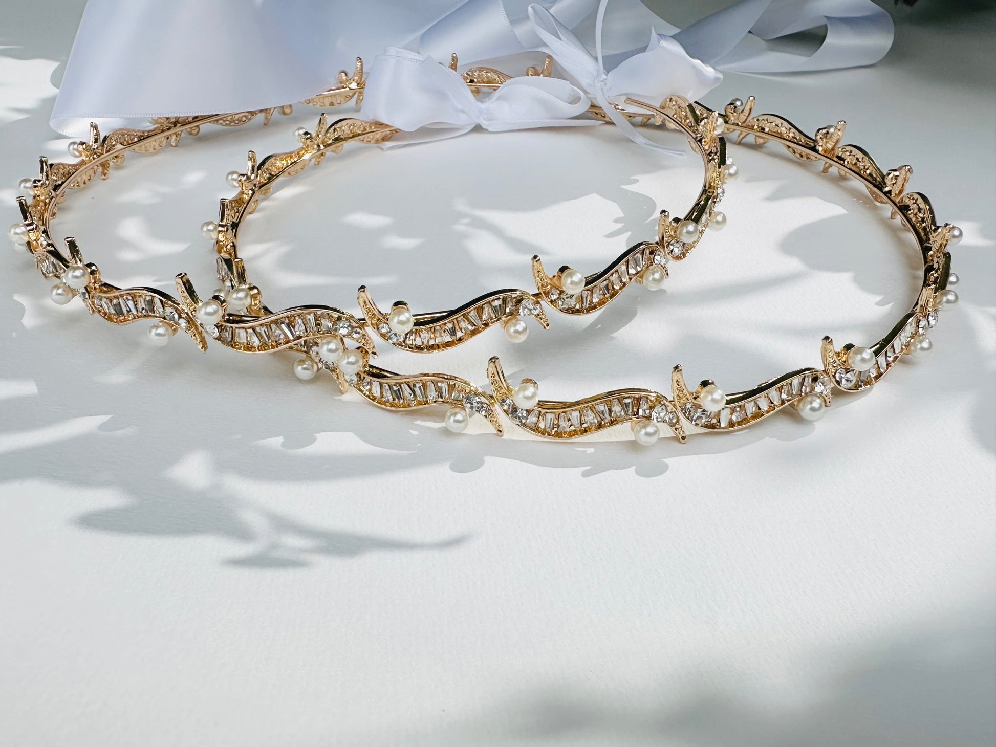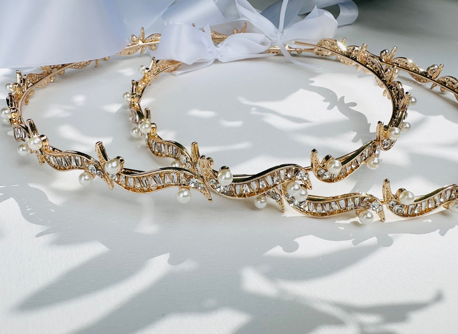 Antique Gold Stefana complete with luscious 5mm white Pearls & quality Crystals